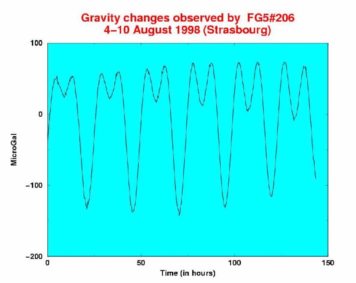 Variations de gravité observées à Strasbourg lors de l'expérience du 4 au 10 Août 1998 montrant le battement entre la composante diurne et semi-diurne des marées terrestres.
