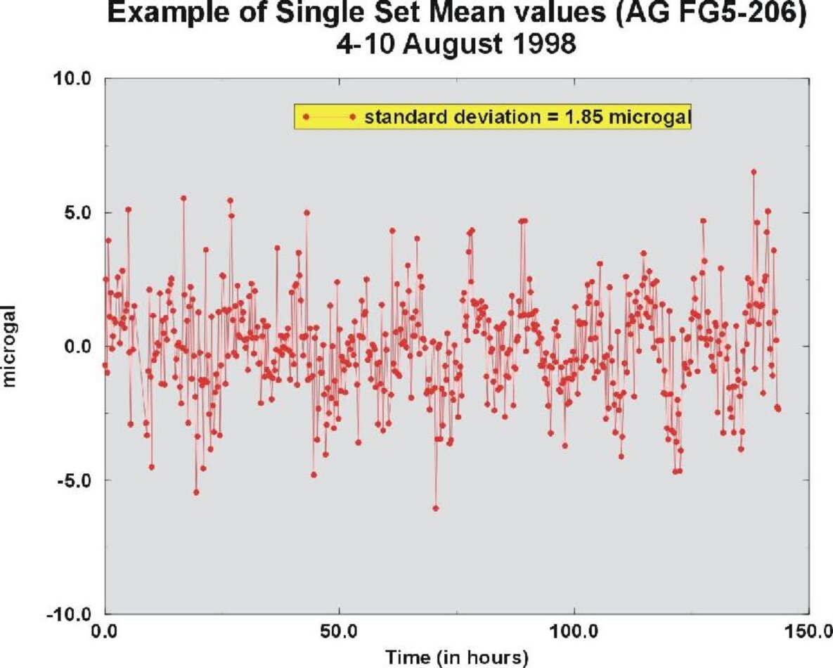 Dispersion des mesures de gravité absolue autour de la valeur moyenne lors de l'expérience du 4 au 10 Août 1998 à Strasbourg ; l'écart type est de 1.85 microgals (données corrigées de l'ensemble des variations temporelles géophysiques, telles que les marées terrestres, la surcharge océanique, l'effet de pression atmosphérique et du mouvement du pôle de rotation terrestre).