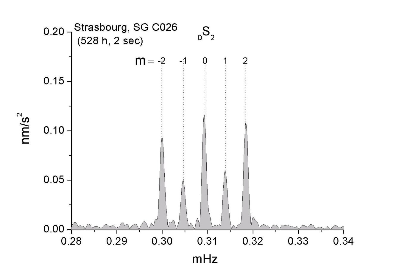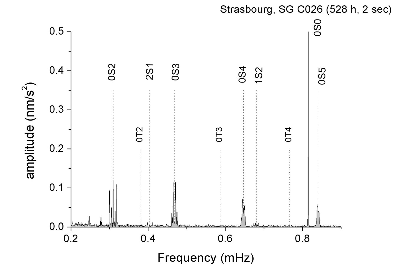 Après une forte excitation (tel qu’un séisme de magnitude > 6.5), la Terre oscille à différentes fréquences : ce sont les modes propres de la Terre. Leur fréquence d’oscillation est liée à la structure interne de la Terre.