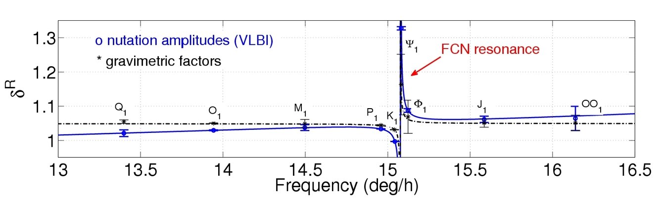 Parce-que la Terre possède un noyau fluide, sa rotation est perturbée. L'effet du noyau liquide, dont l'axe de rotation est incliné par rapport à celui du manteau, se traduit par une nutation libre, appelée Nutation Libre du Noyau (Free Core Nutation). L'effet en rotation est 300 fois plus grand que l'effet en déformation et donc ce mode est mieux observé dans les données de nutations par interférométrie à large bande (VLBI). Cependant, comme cette nutation a une période quasi-diurne dans un repère terrestre tournant, le forçage par les marées diurnes entraînent un effet de résonance associé à la FCN qui se traduit par une amplification ou la réduction de l'amplitude de certaines ondes diurnes. Par ajustement d'un modèle de résonance non-linéaire, il est possible d'estimer les paramètres de la FCN (amplitude et facteur de qualité Q) qui apportent des contraintes sur les couplages à l'interface noyau - manteau (CMB).