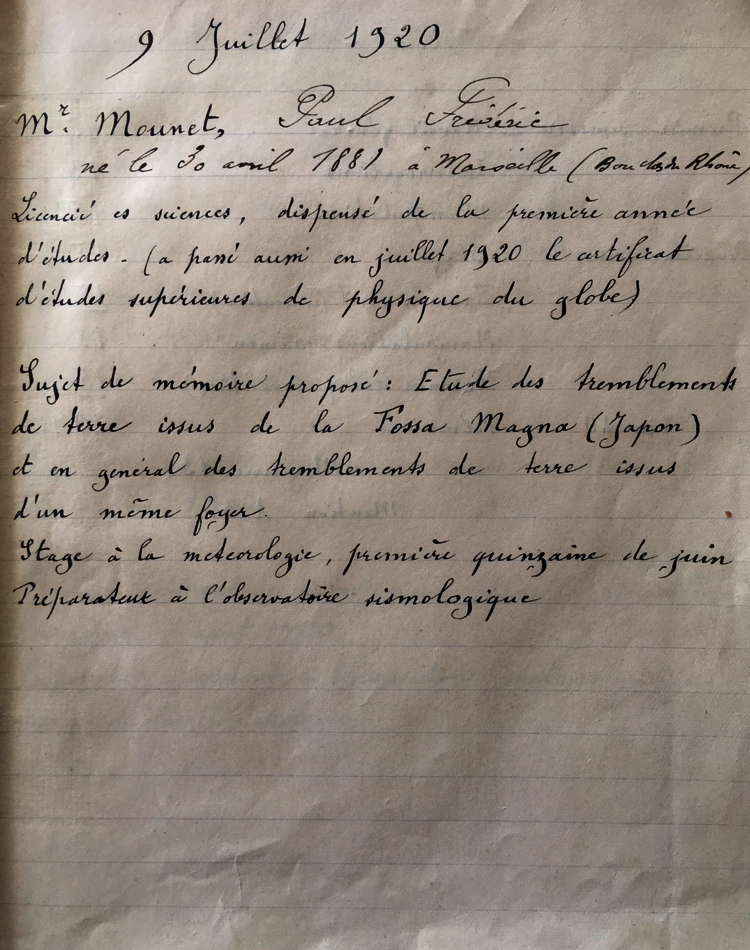Son mémoire s’intitulait : « Etude des tremblements de terre issus de la Fossa Magna (Japon) et en général des tremblements de terre issus d’un même foyer ».