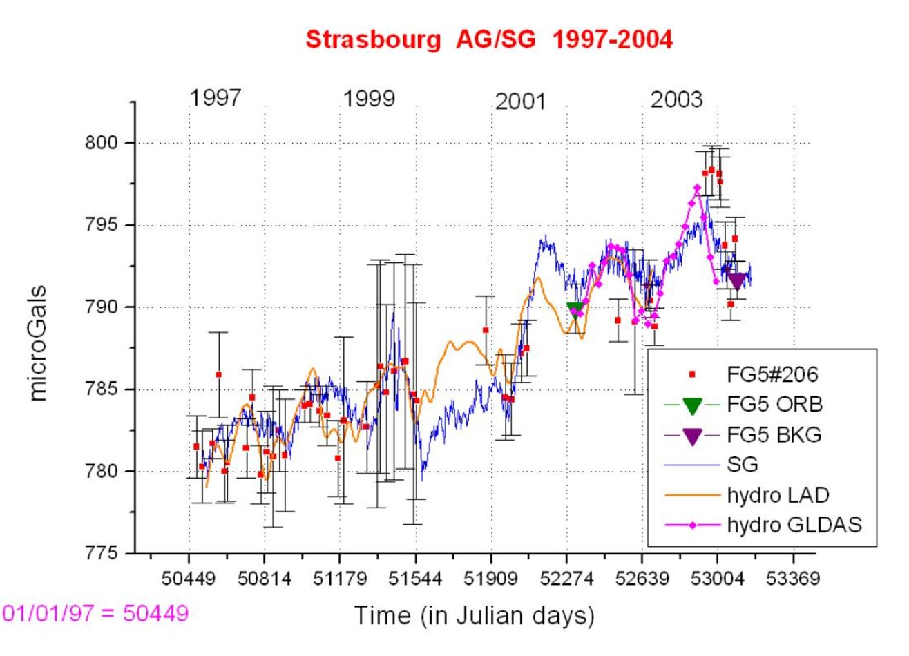 La superposition des mesures de gravité absolue régulières et des mesures continues du gravimètre supraconducteur à Strasbourg a été poursuivie et montre une évolution notable de la pesanteur dans notre site (cf. fig. ci-dessus). Conjointement nous avons aussi analysé la tendance à long terme qui se dégage des mesures de déplacement vertical par GPS, en particulier en étudiant la différence entre une station des Vosges (WELS) et Strasbourg (STJ9). Il y a une convergence pour cette dernière station dans le sens où l’augmentation de pesanteur est aussi accompagnée d’une subsidence apparente cependant trop forte pour être de nature purement tectonique. Nous avons aussi une contribution gravifique à long terme de nature hydrologique (humidité du sol) qui explique certaines variations saisonnières et interannuelles. Il semble néanmoins difficile d’expliquer l’amplitude de la tendance à long terme en gravité par une lente recharge des aquifères régionaux (la pente présente dans les contributions hydrologiques de la figure est fictive et ajustée à la pente de la gravité car la tendance séculaire n’est pas prise en compte dans les modèles globaux de type LaDWorld ou GLDAS).